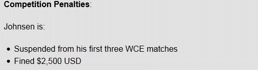 Dennis “Svenskeren” Johnsen将会受到:1)总决赛前三场比赛禁赛;2)2500美金罚款